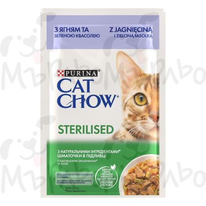 :CAT CHOW® STERILISED, за кастрирани котки над 1 година с Агне и Зелен Фасул, Мокра храна, Пауч в сос