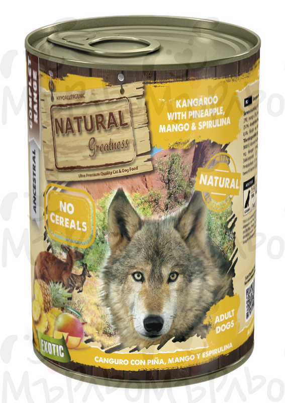 :Пълноценна консервирана храна за кучета с екзотично кенгурово месо, допълнено с ананас и спирулина. Рецептата е богата на протеин, витамини и антиоксиданти, които подпомагат имунната система, храносмилането и жизнеността.