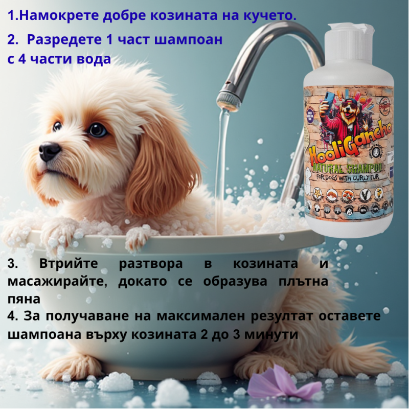 :Намокрете добре козината на кучето. Разредете 1 част шампоан с 4 части вода. Втрийте разтвора в козината и масажирайте, докато с