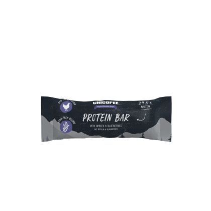 :Протеинов енергиен бар за кучета над 1 година. Богат на прясно пилешко, със сушени ябълки и боровинки. Идеален за активни кучета.