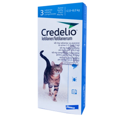 :Credelio е дъвчаща таблетка за котки, предназначена за лечение и профилактика на опаразитяване с бълхи и кърлежи. Продуктът осигурява бързо и продължително действие – убива бълхите (Ctenocephalides felis и C. canis) и кърлежите (Ixodes ricinus) до 1 ме...