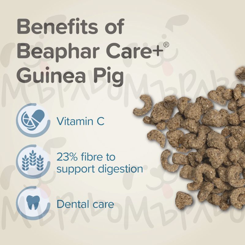 :Beaphar Care+ е супер премиум храна за морски свинчета,която се отличава с висока усвояемост, ниско съдържание на мазнини и богат комплекс от витамини, минерали и натурални добавки като ехинацея, спирулина и пребиотици FOS и MOS.