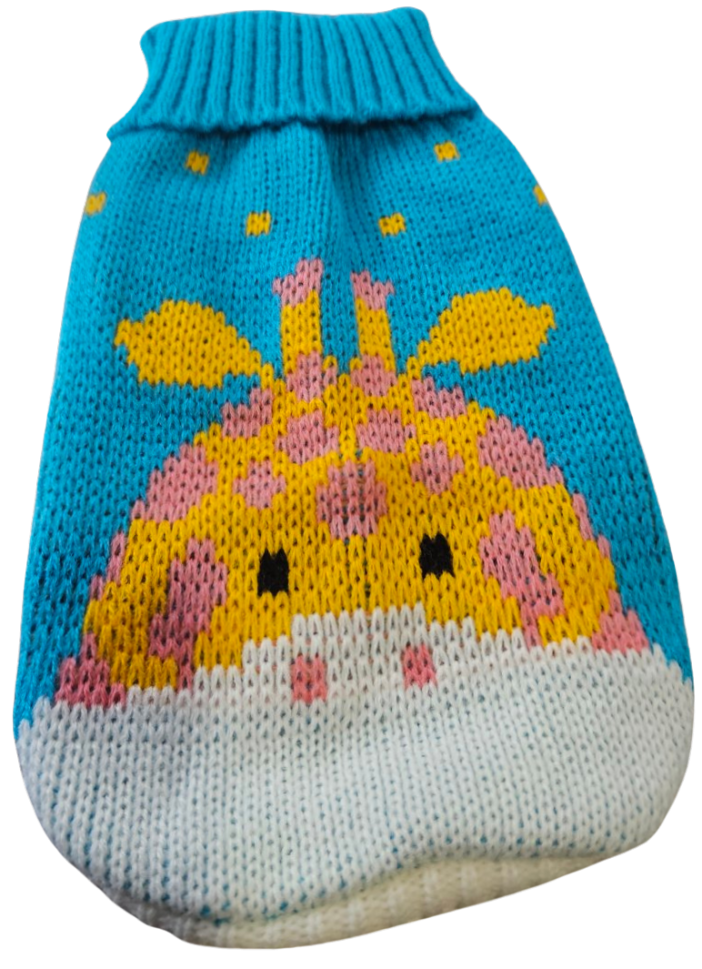 :Топъл и мек плетен пуловер с весела апликация „жираф“, подходящ за малки породи кучета. Моделът е изработен от мека акрилна прежда, която осигурява комфорт и топлина през по-хладните сезони. Пъстрата детайлна плетка и ярките цветове придават свеж и игр...