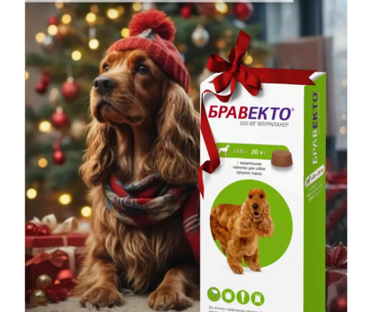 :Bravecto 500 mg е дъвчаща таблетка за средно големи кучета (>10–20 кг), предназначена за лечение и профилактика на опаразитяване с бълхи и кърлежи. Осигурява бързо действие и защита за период до 12 седмици.