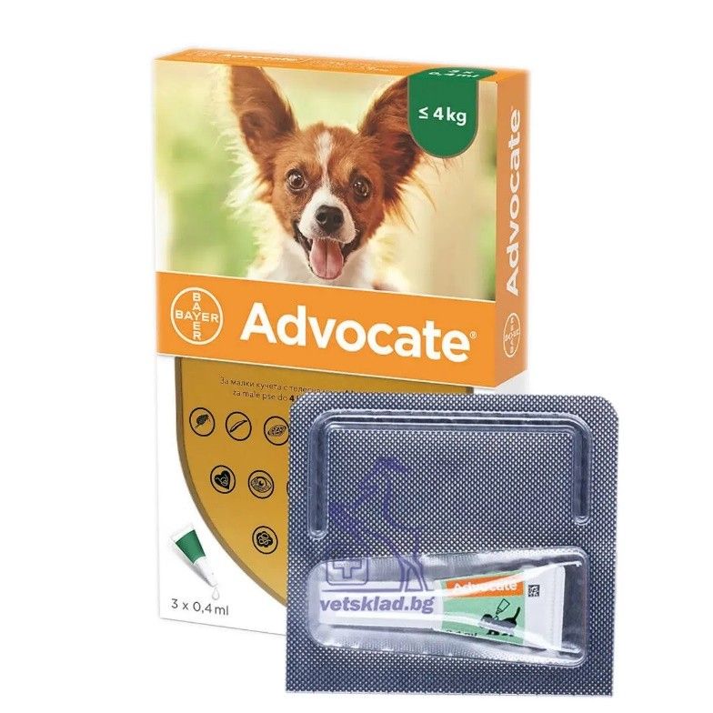 Адвокейт пипета за кучета до 4 кг – защита срещу бълхи, кърлежи, краста, дирофилария и вътрешни паразити. Съдържа имидаклоприд и моксидектин. Едно накапване предпазва 4 седмици. Само за външна употреба. Подходящо за малки породи.