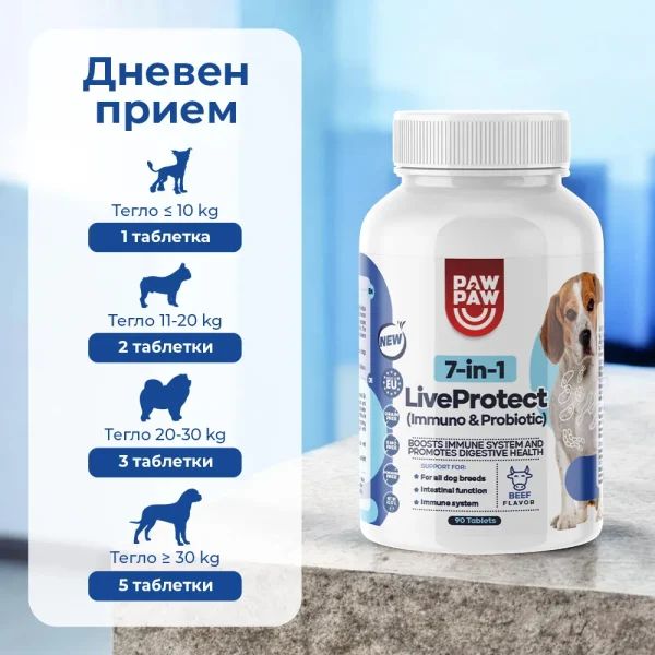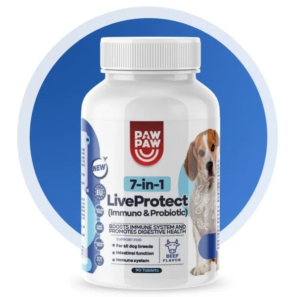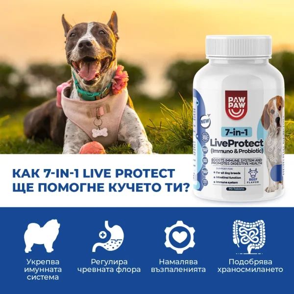 📌 7-in-1 Live Protect е щадяща, но мощна подкрепа отвътре – за силна имунна система, спокоен стомах и по-здраво куче ден след ден.