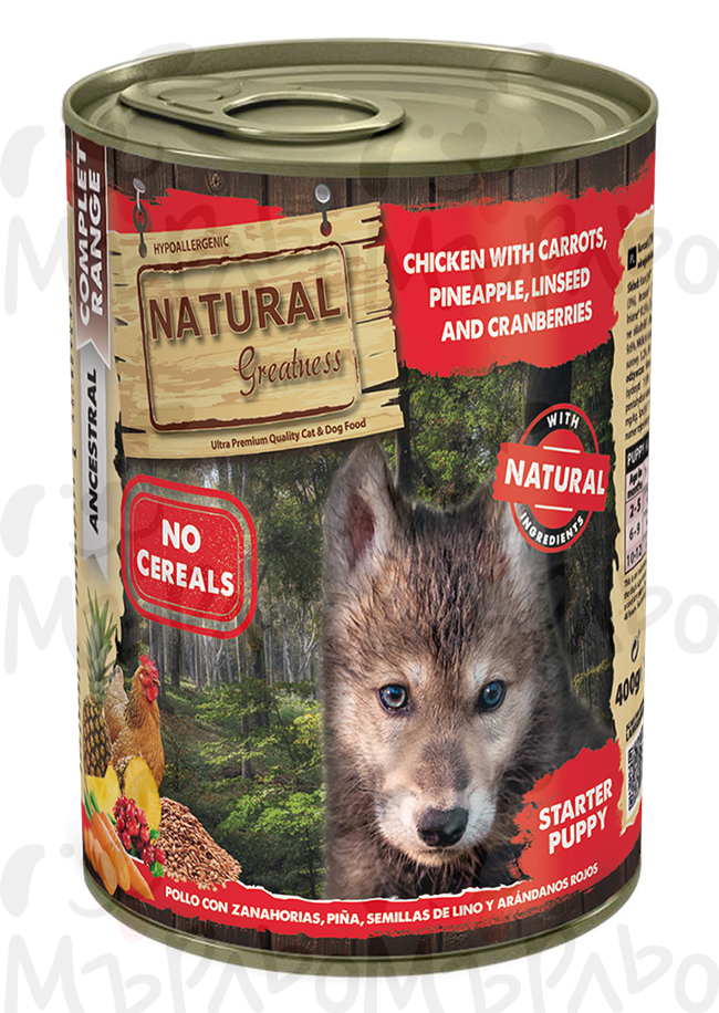 Natural Greatness Puppy с пиле, ананас, моркови, ленено семе и червени боровинки е пълноценна мокра храна, специално създадена за кученца. Осигурява всички необходими хранителни вещества за правилен растеж и развитие. Формулата е без зърнени култури, изкуствени оцветители и консерванти. Натурална, вкусна и питателна храна за здрав старт в живота.