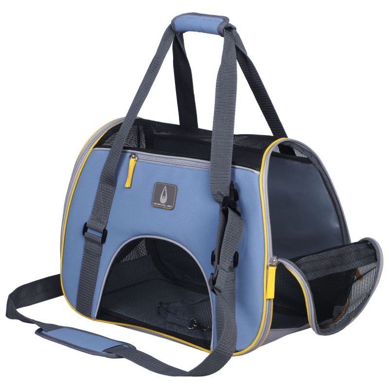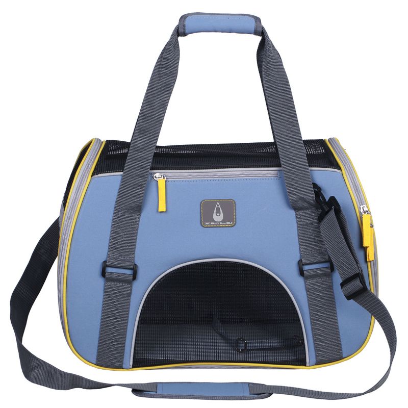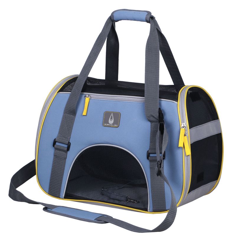 Транспортна чанта Zu & Lu Alor Blu с деним и сиво, размер 40×20×33 см, с къси дръжки и регулируема презрамка. Изработена от здрав полиестер 600D с водоотблъскваща подплата. Отлична видимост и вентилация за вашия любимец – може да подпре глава навън или да се скрие удобно вътре.