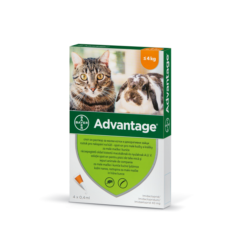 Advantage® – спот он решение срещу бълхи за котки и декоративни зайци. Съдържа Imidacloprid – 10%. Осигурява защита до 4 седмици (1 седмица при зайци). Лесно приложение. Подходящ за животни над 8/10 седмици.
