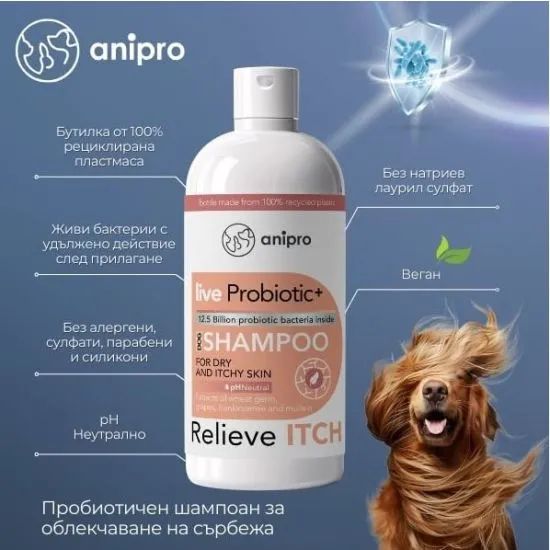 Anipro Live Probiotic+ Relieve ITCH е иновативен шампоан с 12,5 милиарда живи пробиотика, специално разработен за кучета с суха, чувствителна и сърбяща кожа.