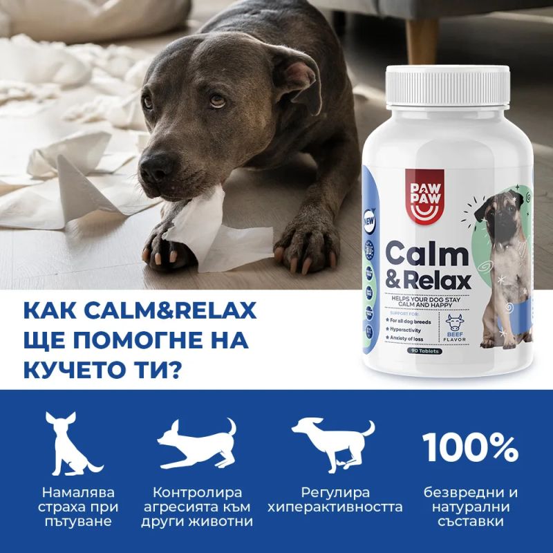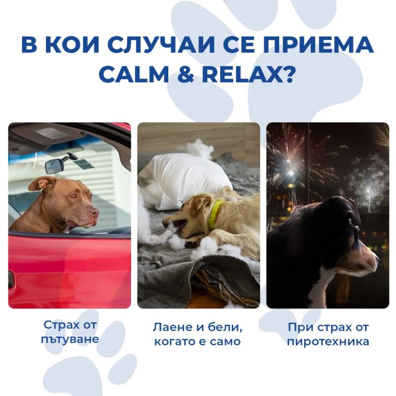 Calm&Relax е натурална хранителна добавка за кучета, която намалява стрес, страх и хиперактивност. Подходяща при пътуване, фойерверки, агресия и раздразнителност. В опаковка от 90 таблетки – достатъчна за до 45 дни при средни породи.