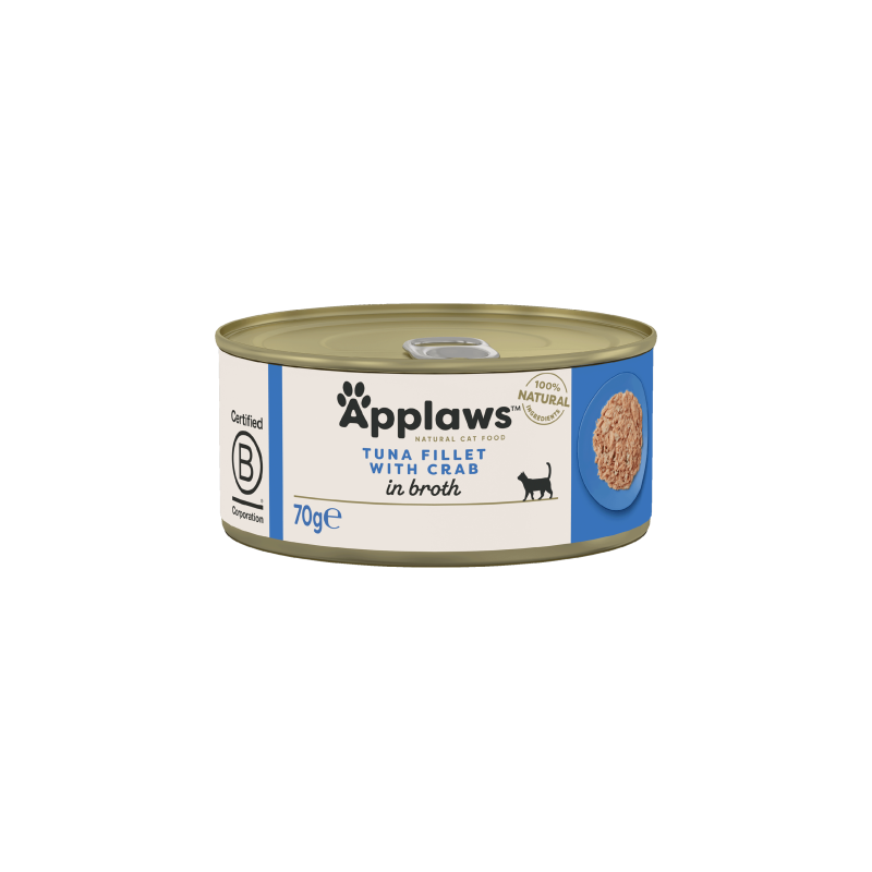 Applaws Senior Tuna with Crab 70 g е натурална консерва в бульон, специално създадена за възрастни котки. Съдържа висок процент филе от риба тон и добавени раци за изключителен вкус и лесно усвояем протеин. Леката текстура и ниското съдържание на мазнини я правят подходяща за котки с чувствително храносмилане и понижен апетит. Формулата е без глутен, пшеница, соя и изкуствени добавки.
