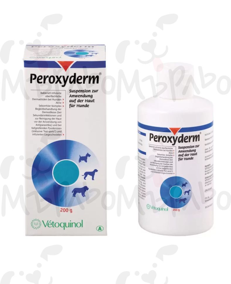 Vetoquinol Peroxyderm е медицински шампоан за кучета, предназначен за лечение и поддържаща грижа при себорея, демодекоза, дълбока пиодермия, маласезия и инфектирани мазоли. Съдържа бензоил пероксид, който притежава антибактериално, антисеборейно и кератолитично действие, почиства в дълбочина и дезинфекцира космените фоликули. Подходящ за кучета с мазна, проблемна или възпалена кожа.