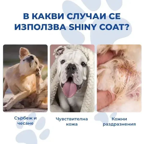 Shiny Coat е нежен шампоан и балсам 2 в 1, създаден да подхранва, хидратира и предпазва кожата и козината на кучето. Формулата с натурални масла от зехтин, кокос и арган, екстракти от алое вера и лайка, както и протеини от пшеница, прави козината блестяща, мека и лесна за разресване. Подходящ за всички породи и възрасти, включително чувствителна кожа. Хипоалергенен, с лек и свеж аромат.