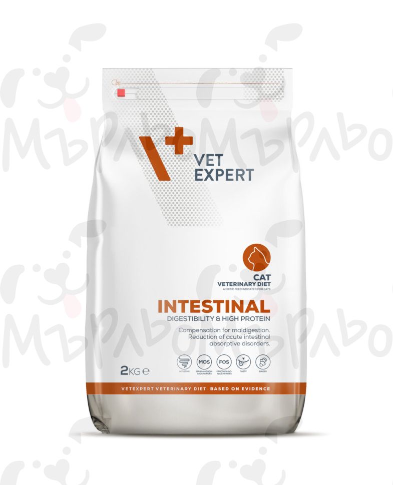 Vet Expert Cat Diet Intestinal 2 kg е балансирана ветеринарна диетична суха храна, предназначена за компенсиране и намаляване на храносмилателни и чревни нарушения при котки. Формулата е разработена да подпомага чревната абсорбция и да осигурява необходимите хранителни вещества при състояния, свързани с лошо храносмилане.