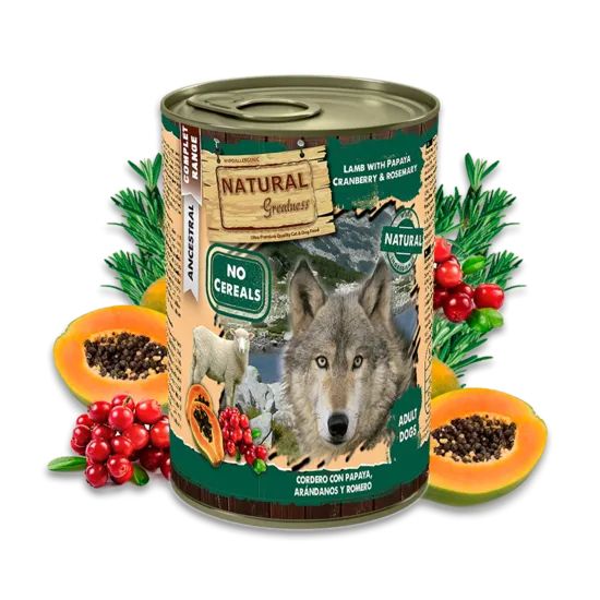 Natural Greatness с агне, папая, боровинки и розмарин е пълноценна мокра храна за възрастни кучета от всички породи. Агнешкото месо осигурява лесноусвоим протеин, а комбинацията от плодове и билки подкрепя имунната система и храносмилането. Без зърнени култури, соя и изкуствени добавки – само натурални съставки с превъзходен вкус. Идеален избор за чувствителни кучета.