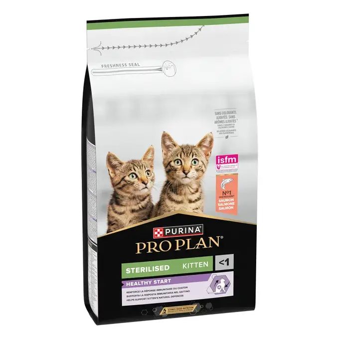 Purina Pro Plan Sterilised Kitten със сьомга е пълноценна суха храна, специално разработена за кастрирани котенца до 1 година, както и за бременни и кърмещи котки. Съдържа високо количество протеин (40%) и ниско съдържание на мазнини за поддържане на идеално тегло. Формулата OPTIStart® с коластра, витамини и Омега мастни киселини подпомага имунната система, здравословния растеж и развитието на мозъка и зрението.