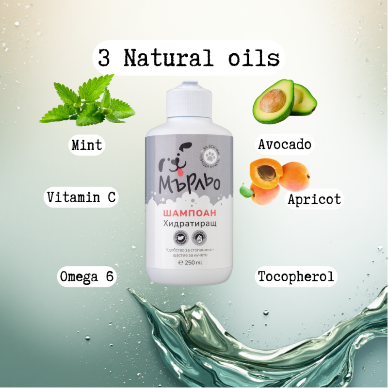 Мърльо хидратиращ шампоан е специално разработен за кучета със суха, чувствителна или раздразнена кожа. Комбинацията от масла – лютива мента, авокадо и кайсиеви ядки – осигурява дълбока хидратация, успокояване и подхранване. Козината става мека, плътна и блестяща, а кожата – спокойна и еластична.