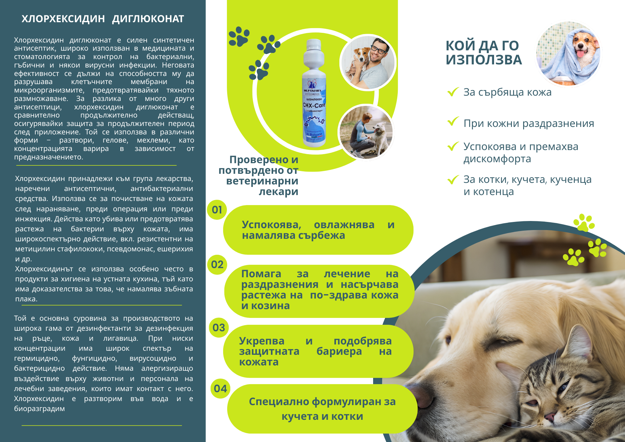 Dr. Panchev CHX-Care е ветеринарен дерматокозметичен шампоан с хлорхексидин диглюконат 3%, предназначен за кучета и котки с кожни проблеми, причинени от бактерии и гъбички. Има антисептично, успокояващо и почистващо действие, като възстановява бариерната функция на кожата и намалява сърбежа. Подходящ за редовна употреба при чувствителна кожа.