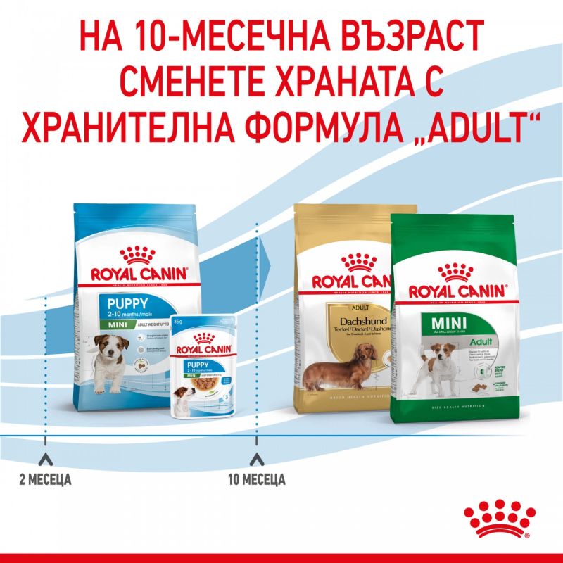 Royal Canin Mini Puppy е балансирана суха храна за кученца от малки породи (до 10 кг) от 2- до 10-месечна възраст. Подпомага имунната система, подпомага развитието на мозъка благодарение на омега-3 (DHA), осигурява висока енергия за растеж и подпомага лесното храносмилане.