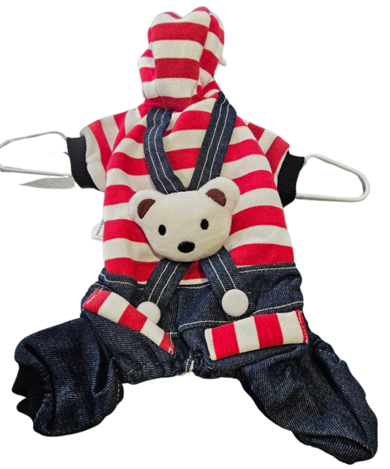 Гащеризонът с мече е едно от най-милите и ефектни облекла за малки домашни любимци. Горната част е изработена от меко трико с червено-бели райета, допълнено с качулка за повече топлина и стил. Долната част представлява джинсови панталонки с декоративни презрамки, наподобяващи реален гащеризон, а отпред е добавено пухкаво 3D мече, което придава уникален и чаровен вид.