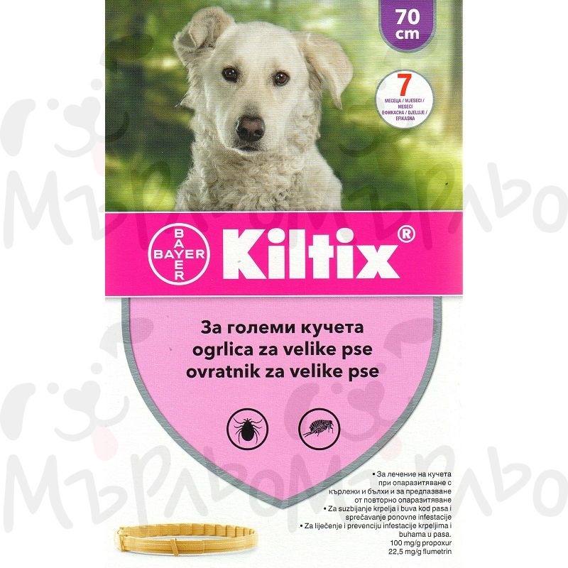 KILTIX 70 см – противопаразитна каишка за големи кучета. Осигурява до 7 месеца защита срещу кърлежи и бълхи. Съдържа пропоксур и флуметрин. Убива паразитите до 24 часа след поставяне. Подходяща за големи породи.